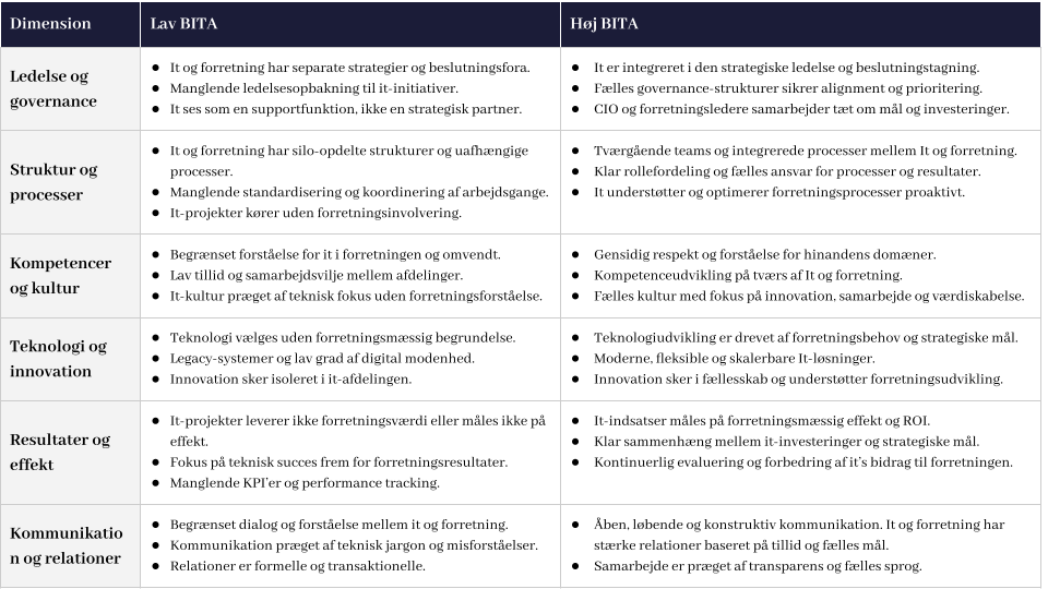 BITA-modellen (Business-IT Alignment) skaber overblik over, hvor godt organisationens strategi, it og forretning hænger sammen – vurderet på seks centrale områder: